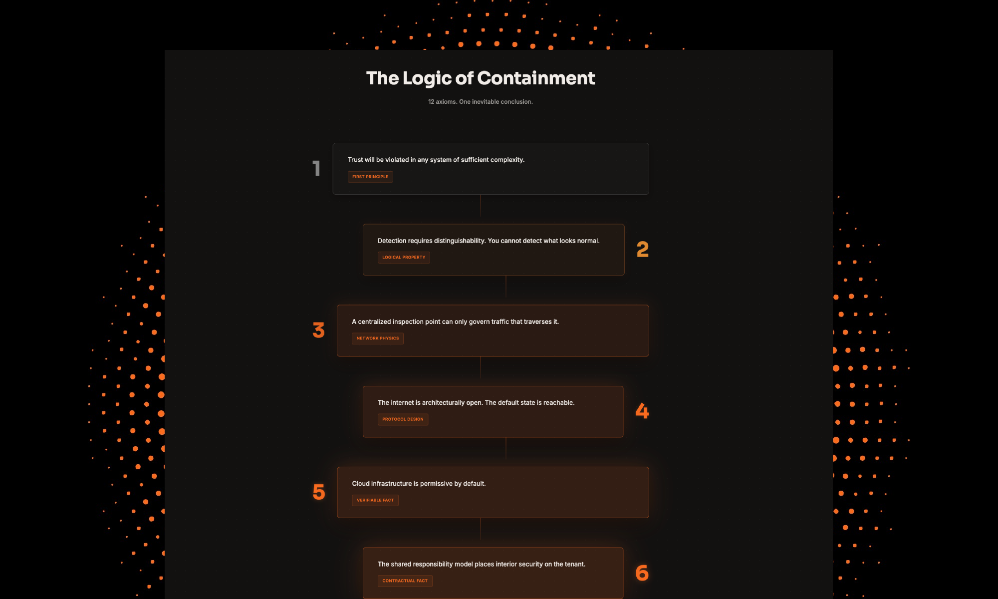 The internet is open. The cloud is permissive. Attackers are multiplying. These aren't opinions — they're structural facts. Each axiom follows from the last, with no assumptions and no escape hatches. The conclusion isn't a pitch. It's what the architecture demands.
